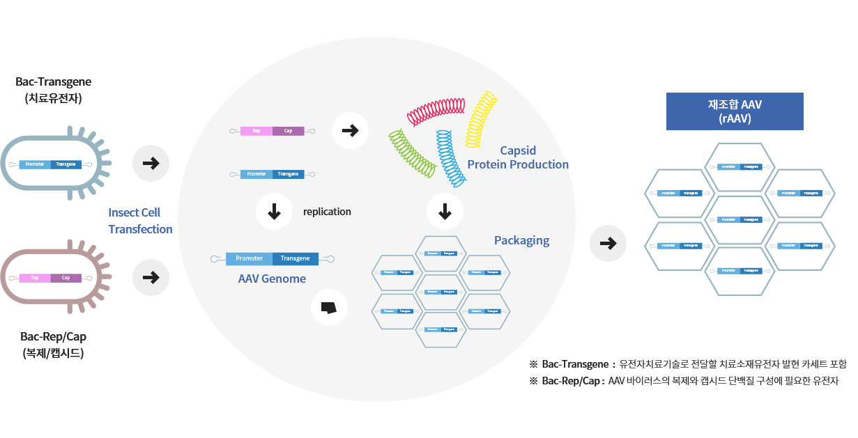 BDVM은 AAV genome 복제 및 virus capsid 단백질 발현에 필요한 Rep/Cap 유전자와 치료유전자(Transgene)를 각각 포함하는 2가지 종류의 Baculovirus를 Sf9 곤충세포에 이중도입(Dual Infection)하여 재조합 AAV (Recombinant AAV; rAAV) 벡터를 제조하는 기술입니다.