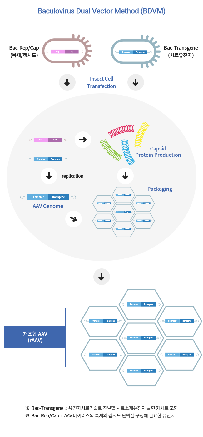 BDVM은 AAV genome 복제 및 virus capsid 단백질 발현에 필요한 Rep/Cap 유전자와 치료유전자(Transgene)를 각각 포함하는 2가지 종류의 Baculovirus를 Sf9 곤충세포에 이중도입(Dual Infection)하여 재조합 AAV (Recombinant AAV; rAAV) 벡터를 제조하는 기술입니다.